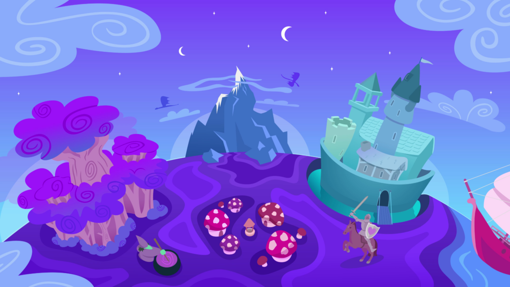 An imposing blue mountain pierces clouds right at the top, with silhouetted dragons gliding all around. Slightly further down to the east is a moated settlement with towering medieval structures. To the west is a forest of pink trunks and purple leaves. A single magnificent tree has punched through the center of the canopy of smaller trees. A witch stirs her cauldron just outside. Down the middle of the world is a toadstool village, each mushroom building with a white-spotted cap of purple and pinkish-red. To the far east is a knight on horseback, with a heart-encrusted shield, and their sword raised gallantly. Near the knight is the shoreline of the ocean. A red ship pulls in and bobs gently with the waves.
