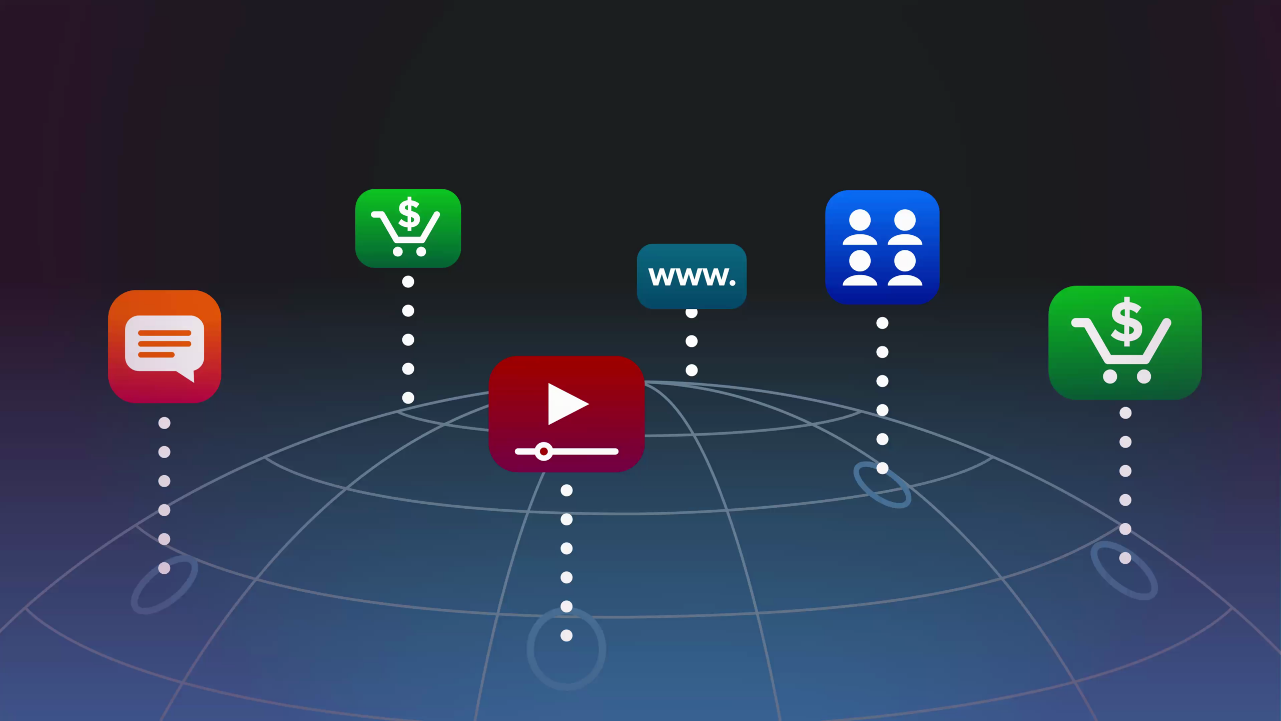 The top portion of a wireframe globe in a mysterious dark space. Dotted lines rise from the surface and end at what look like apps. The apps have icons like a shopping cart with a dollar sign, a www dot, a video player, a speech bubble, and anonymous user profiles.