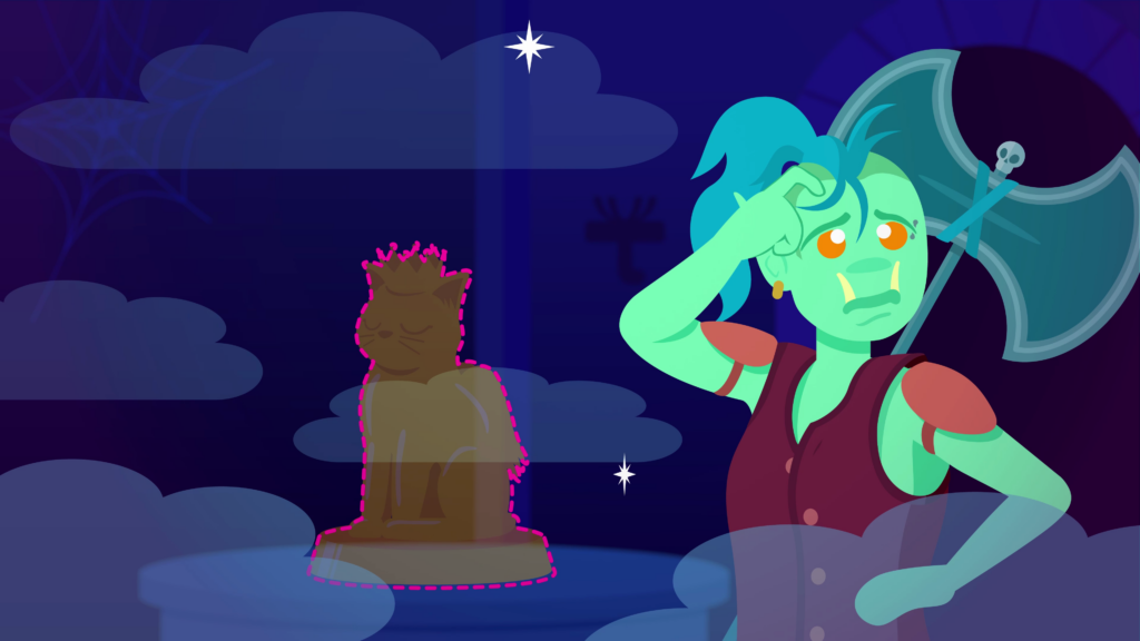 Zooming out from the confused orc, we notice the dark blue room she’s in is clouded by a sparkling mist. In the middle of the room is a faded idol statue of a golden cat, with pegasus wings and a crown. A pink dotted outline highlights the statue for us the viewers, but the orc is unable to spot it.