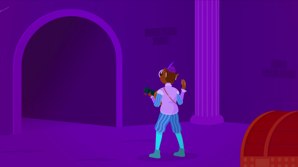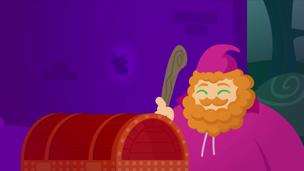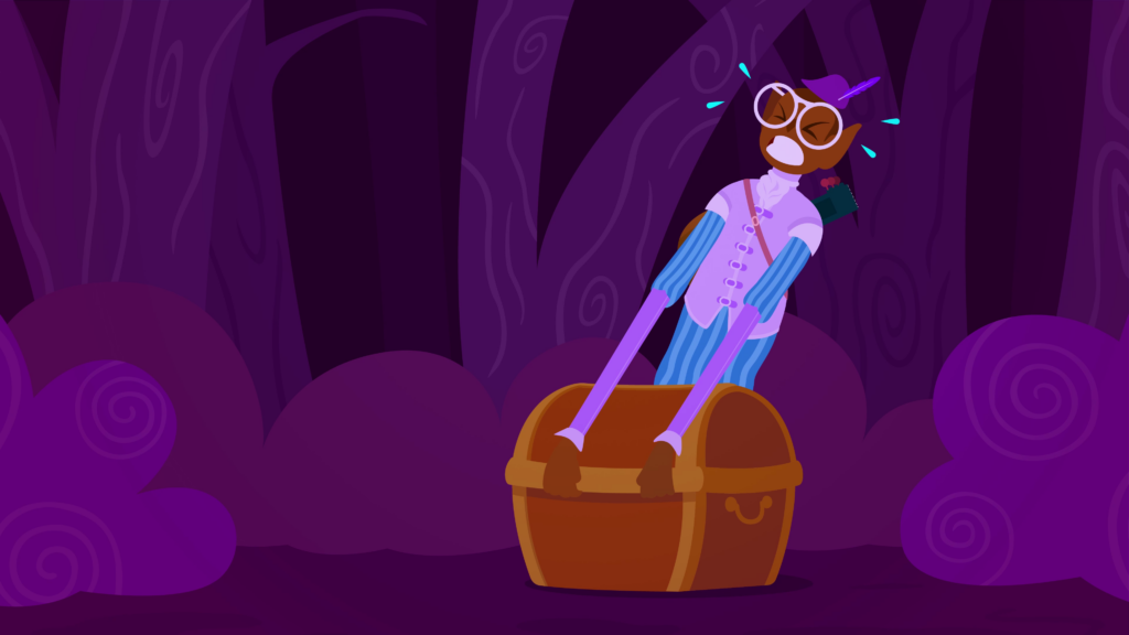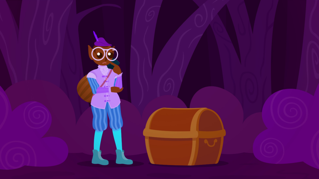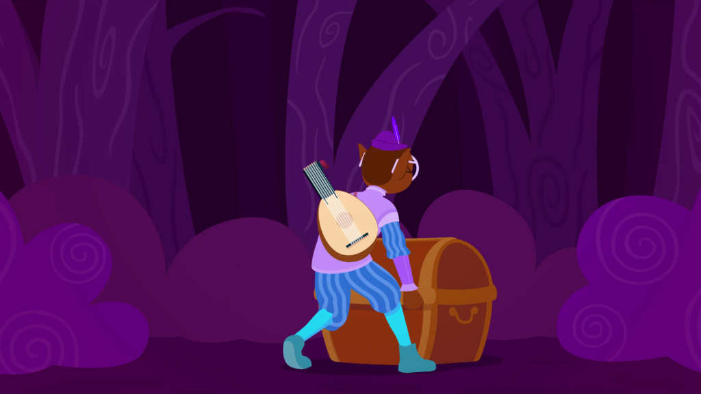 Transition to a purple forest, where a bespectacled dark-skinned elf wearing a traditional medieval bard outfit stands puzzled next to a treasure chest with no lock or switch. He kneels down to try lifting the lid open, to no avail, and with his back turned we see he is armed with a lute. The bard is then seen standing behind the chest with his arms cartoonishly stretched as he desperately pulls on the lid. We hear him struggle as sweat sprays from his head.
