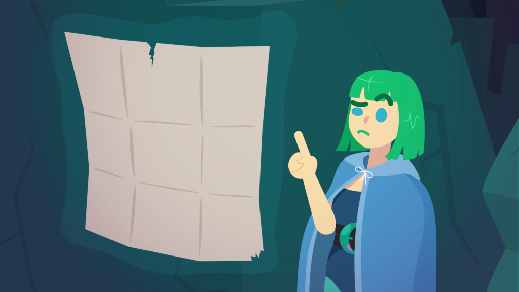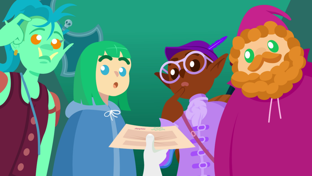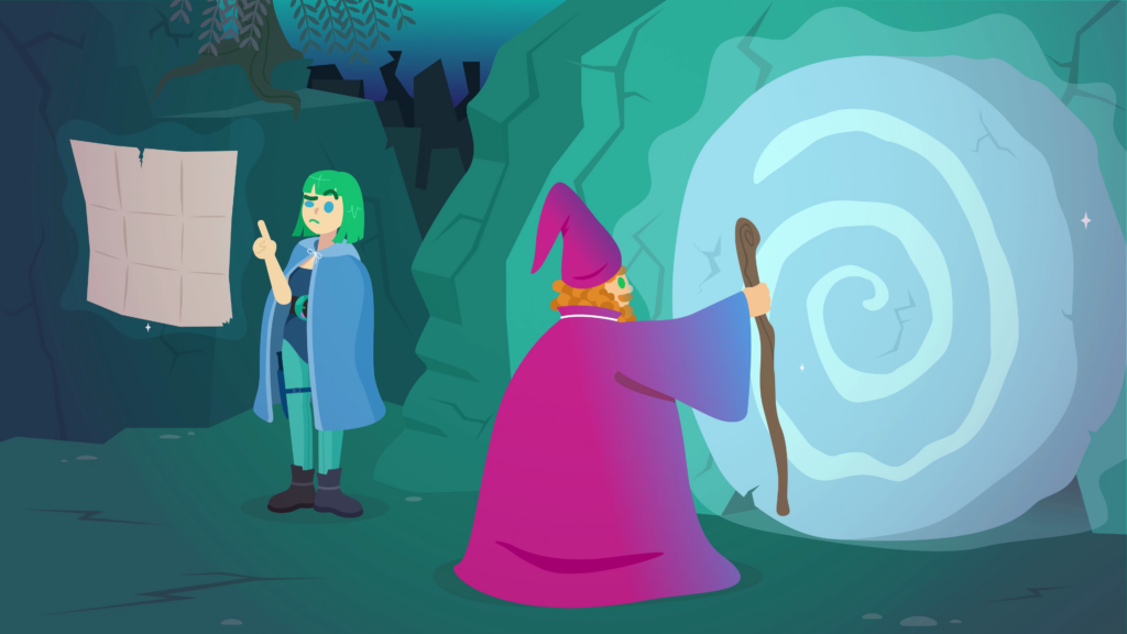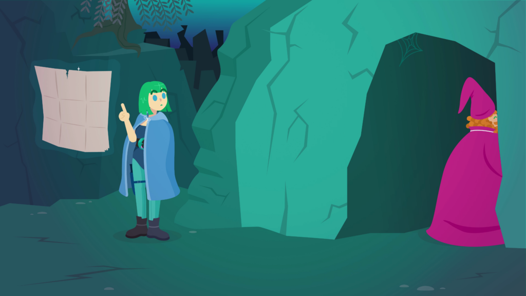 Another transition, to a bluish-green rocky area. There’s a light-skinned mage with short green hair, a blue robe, teal leggings with a knife sheathed at the thigh, black boots, and a corset with a crescent moon belt. She’s using her magic to hover a map in front of her, rotating it with hand gestures, while she frowns with a raised eyebrow. We zoom out and see near to her is a large light-skinned wizard with ginger curly hair and a beard. He’s wearing a bright red robe and a pointy wizard hat, while wielding a staff, which he uses to move a slab of rock out of his way, revealing a hidden cave. As the rock crashes down off-screen, the mage turns to the wizard with surprise, as he happily wanders into the cave. The mage blinks in astonishment.
