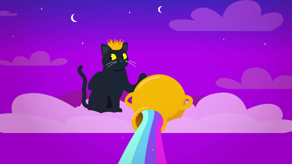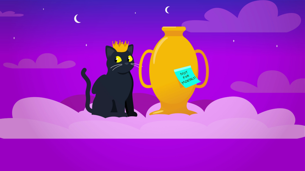 The camera pans upwards into the clouds, where we see a black cat perched on a cloud, with a crown and wings, resembling the golden idol statue earlier. Next to the cat is a large golden vase, with a sticky note that reads: “Not for mortals!”