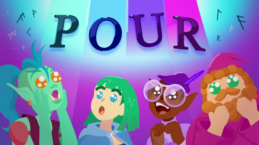 The cat looks side to side suspiciously, before knocking over the vase. A stream of mysterious liquid pours out of it, with streaks of cyan, blue, purple and pink. They wash down above the 4 adventurers: the orc, the mage, the bard, and the wizard, who look up in amazement. The letters that spell POUR hover above them also. We hear sparkles.
