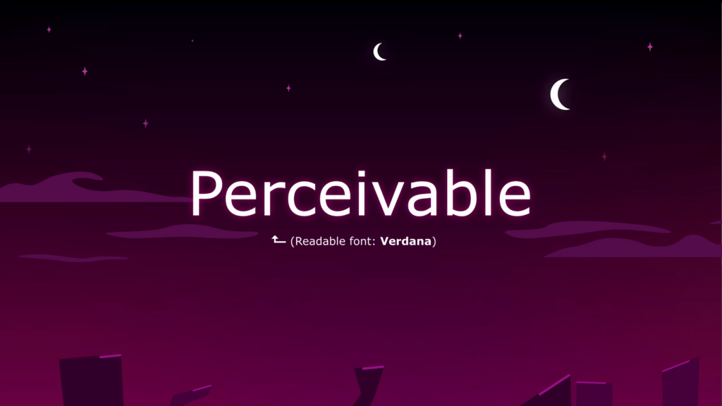 We fade to the next scene, which is a purplish-red night sky with distant clouds gently scrolling by. The word “Perceivable” appears in big letters, with a label that identifies the font as Verdana, a readable font.