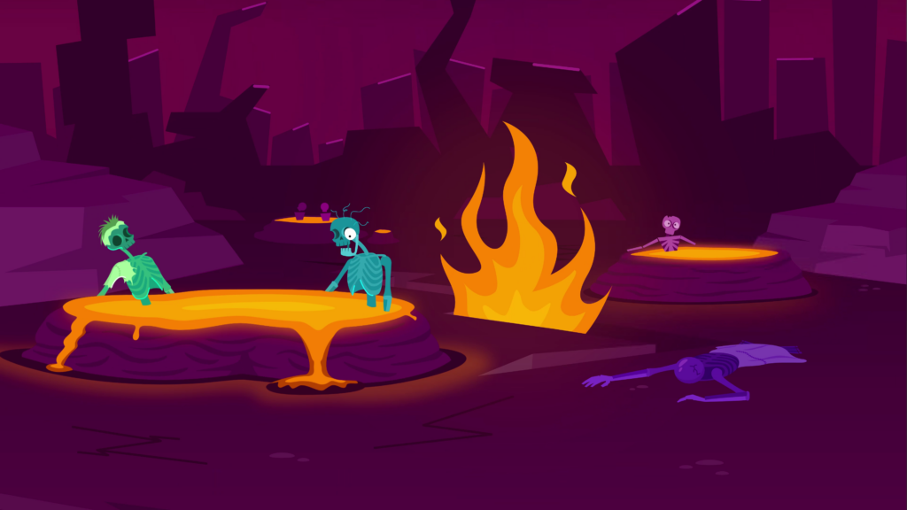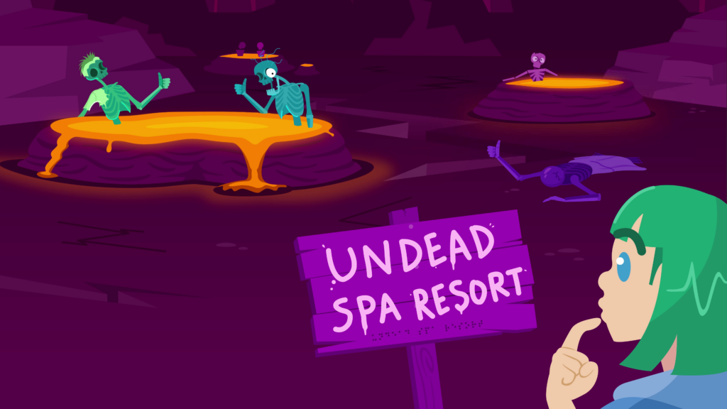 The camera pans down. A rocky and lava-infested hellscape comes into view. Cracks in the ground give way to fire bursting from the depths of the land. Holes filled with lava span the scenery, with skeletons inside them, leaned up against the rims. Eventually we see the mage come into view, studying a wooden sign with painted letters that read: “Undead spa resort” along with a braille translation beneath. The skeletons all give a synchronized thumbs up.