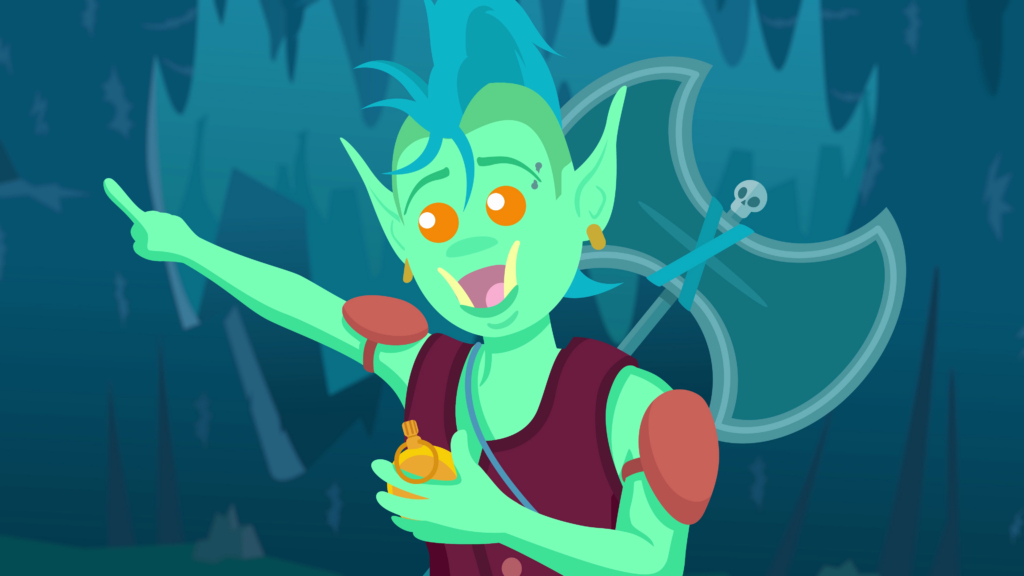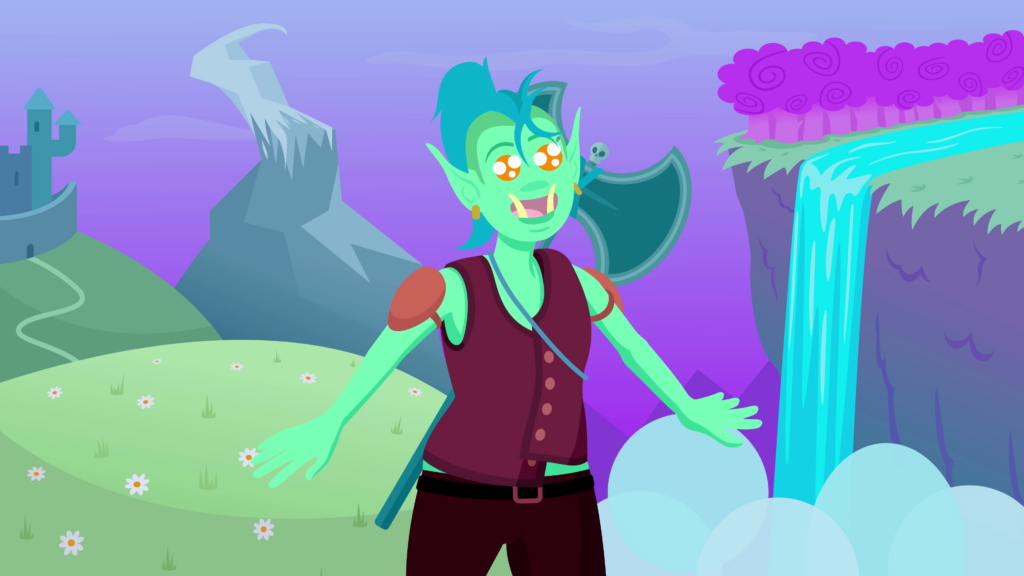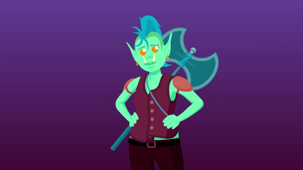 We cut to a dark, blue room, occupied by a confused orc lady, wearing a leather vest with misaligned buttons, and an oversized battle-axe stamped to her back. She scratches her head, which has a blue mohawk dividing her scalp, ending with a ponytail. Her bright orange eyes are weighed on by her strong brow. Two large orc teeth protrude from behind her prominent lower lip.