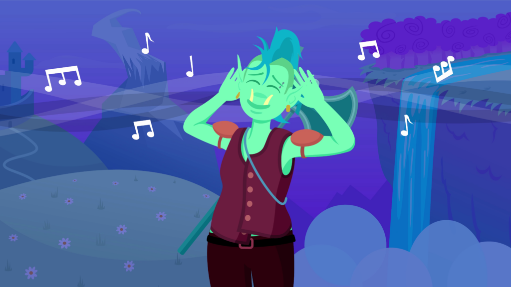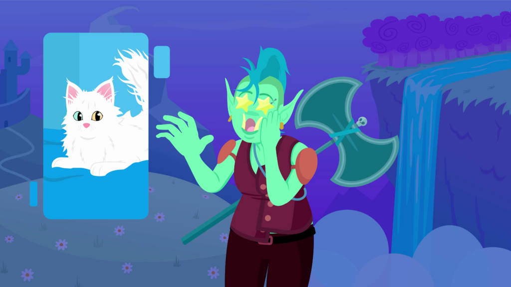 We see the orc stand before a beautiful landscape of flowery hills, snow-capped mountains and a lush waterfall. Her eyes shimmer with amazement. Then she places her hands behind her pointed ears, as she closes her eyes to listen to the flute music flowing by. Finally, stars appear in her eyes and she reaches a hand forward, as she envisions a fluffy white Maine Coon cat with odd-colored eyes.