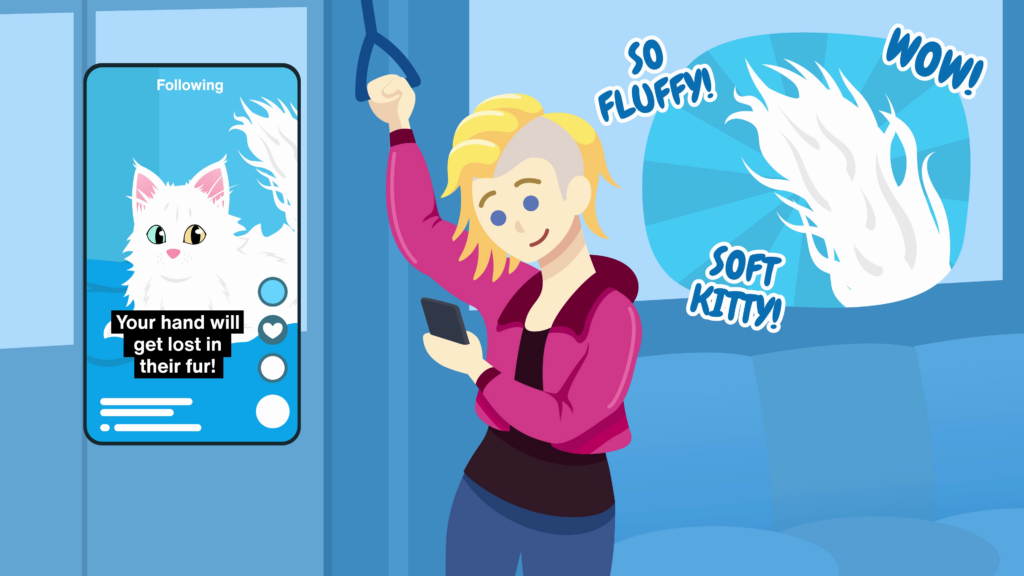 The scene with the orc transforms into a trendy young white woman riding a subway train. She’s holding her phone with one hand while another hangs onto a ceiling handle, keeping herself steady. She’s viewing the Maine Coon on her phone through a social media app playing video. It has captions that read: “Maine Coons are incredibly fluffy. Your hand will get lost in their fur!” The woman imagines the cat’s tail and is delighted at how soft and fluffy it is.