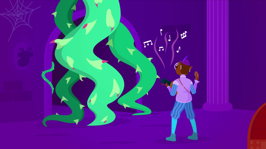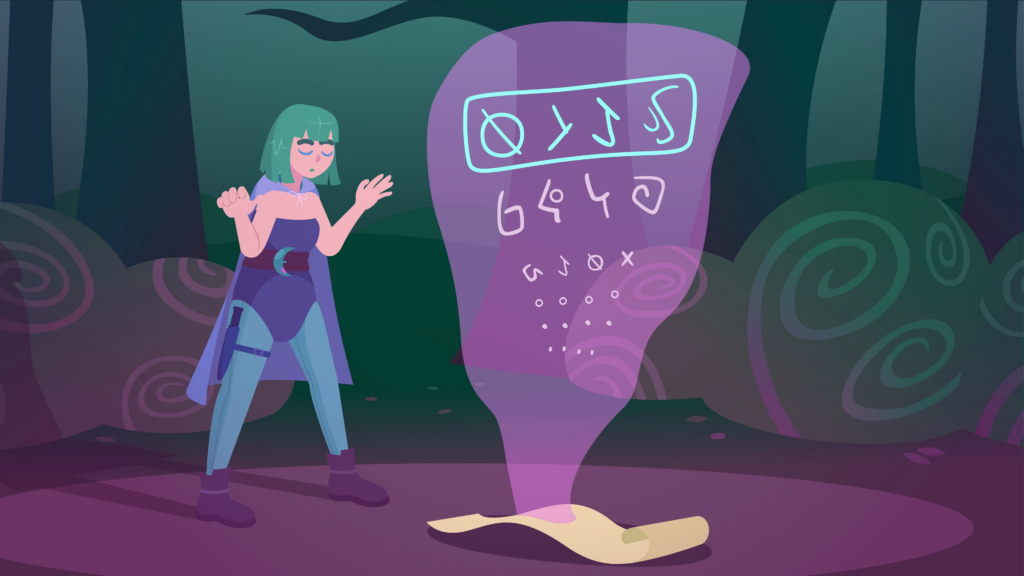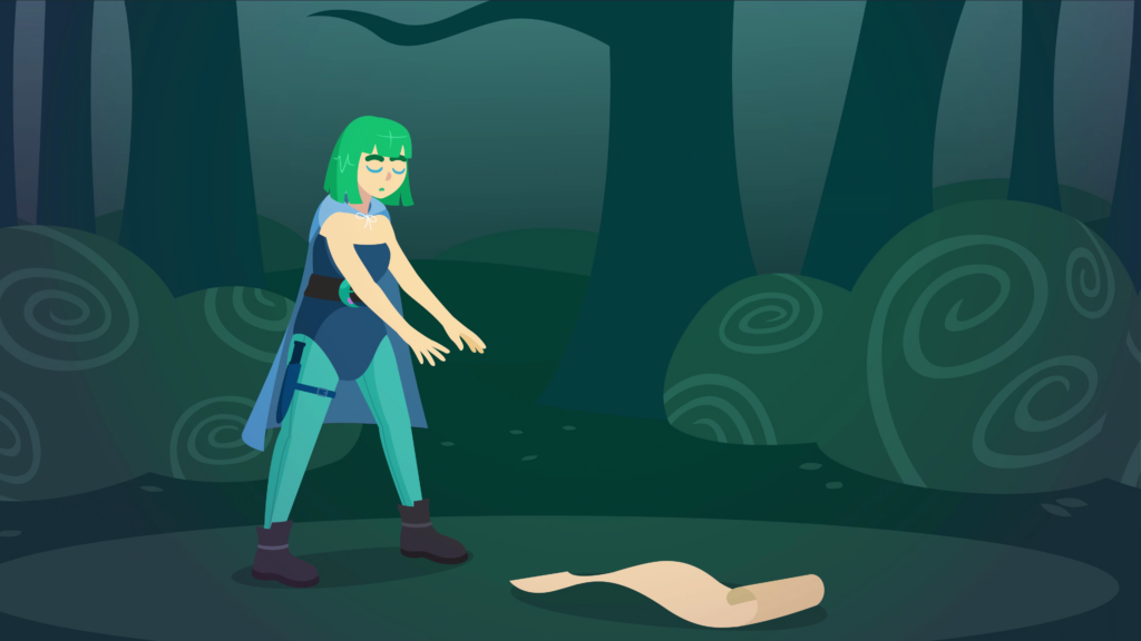 We’re in a purple brick interior, with ancient columns and cobwebs. The bard stands before a bundle of sharp vines blocking a doorway. He plays a note on his lute, and the vines magically retract to clear the doorway. We pan to the side and see the wizard, tapping his staff against a treasure chest to open it. A white-spotted grey cat pops out from the pile of coins, to the wizard’s surprise. The camera eventually settles as it pans outside, where the mage is stood in an open space surrounded by trees and bushes. In front of her is a scroll on the ground. With a wide stance, she closes her eyes and summons an aura from the scroll, with strange runes floating before her, with a line at the top highlighted.