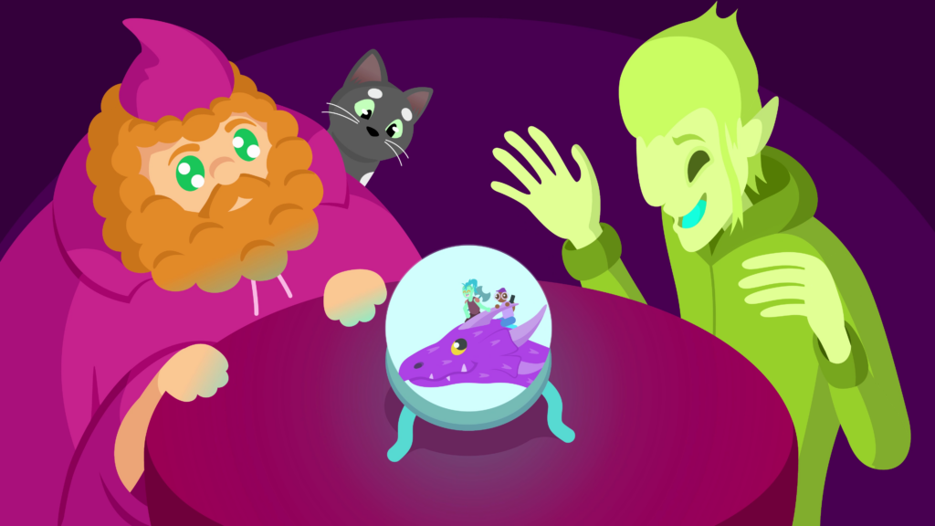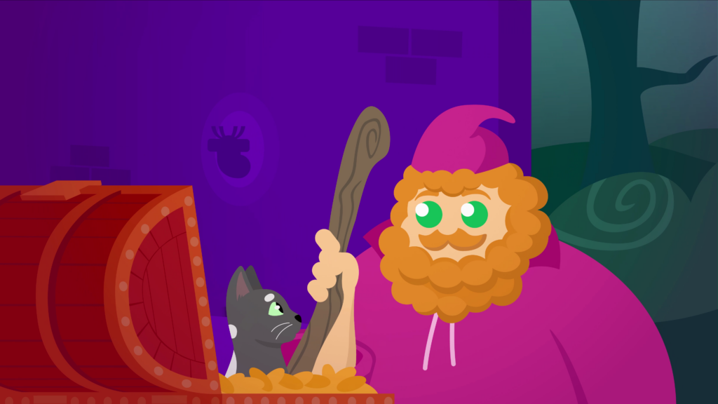 It’s revealed that we were watching this unfold through a crystal ball, in an unknown location. The ball sits on a round table draped in a red cloth. On one side is a bright-green elf-like person with empty eye sockets, hovering their hands around the ball, with a big grin on their face. Opposite is the wizard, staring with wonder at the crystal ball’s imagery. The spotted cat he found earlier in the treasure chest appears from behind his shoulder, also looking with interest.