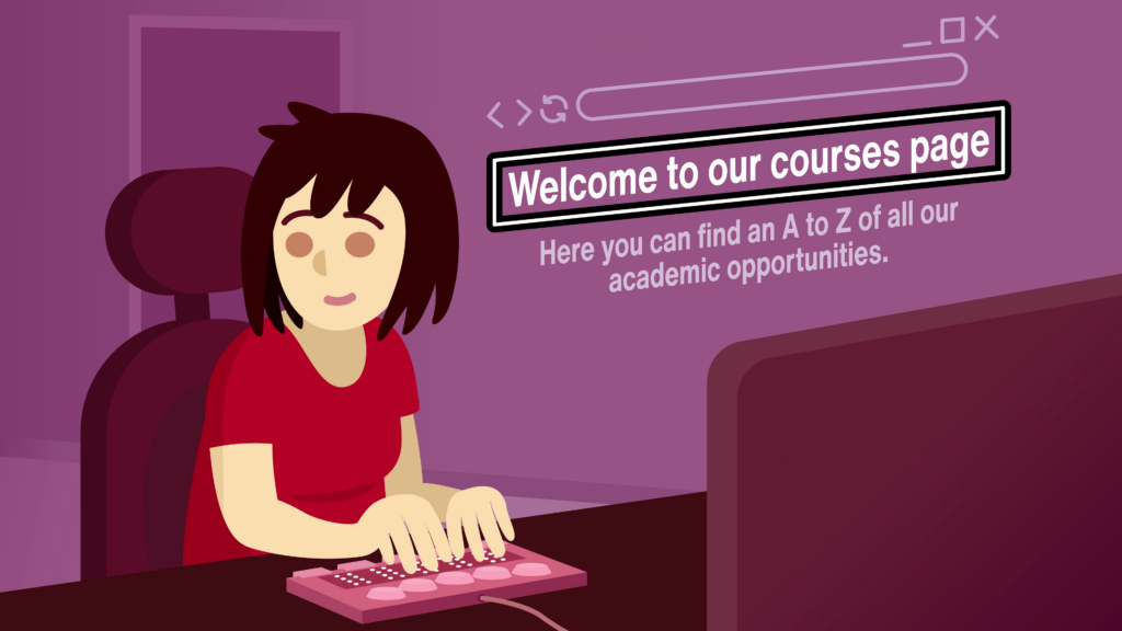 The scene transforms to an east-Asian woman running her fingers along a braille display, while we see the contents of her desktop monitor show a web browser. The webpage has a heading, with a black and white focus state around it, that reads: “Welcome to our courses page”. Beneath the text reads: “Here you can find an A to Z of all our academic opportunities.”