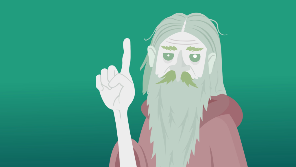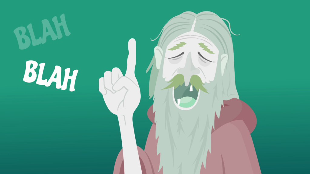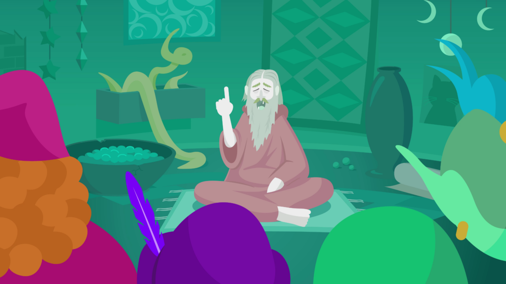 A grey-skinned old man with a droopy face, long hair and beard raises a crooked finger as he blathers on, literally saying blah blah blah over and over. He’s sitting cross-legged in a room of mystical trinkets, vines, and ornaments of crescent moons.