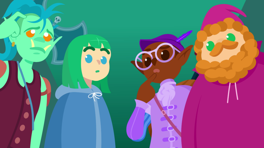 The four adventurers stand before him, completely bewildered. The orc scratches her head, the bard touches his chin thoughtfully, the wizard stares blankly, and the mage looks stunned.