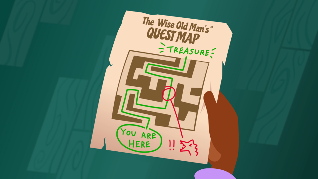 The old man grumbles in annoyance, and hands them a map. We see it’s a crude map, resembling a children’s maze puzzle that’s already been completed, showing the starting point and the end point where treasure can be found, and warning a monster along the way. The map has a title: “The Wise Old Man’s, trademark, Quest Map”.