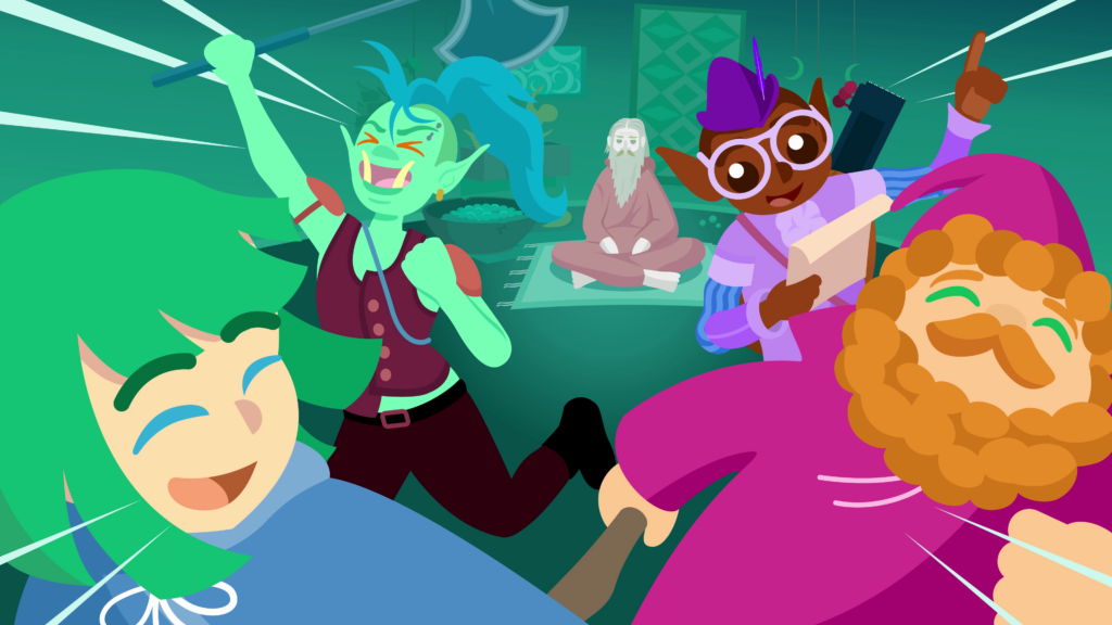 The streams pull back to reveal the adventurers celebrating their find of the treasure room, with the bard and mage high-fiving in mid-air, the orc lifting the golden cat statue from the start high above her head triumphantly, and the purple dragon sitting proudly with a golden neck piece.