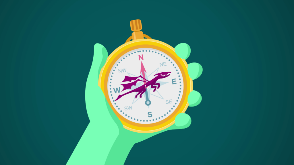 We see an old golden compass held by the orc. It’s very normal, except for the dragon-shaped pointer, wiggling slightly. The orc’s mouth is agape and her eyes are wide, as she points over in the direction of the dragon compass without looking.