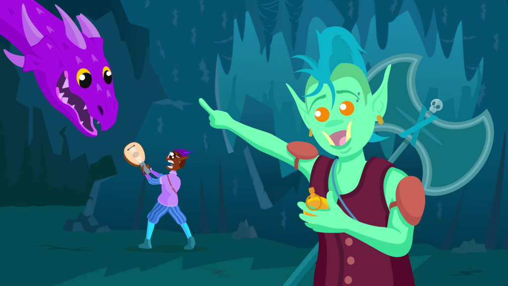 We pan over that way to reveal the bard holding his lute in a defensive manner, as a large purple dragon with crocodile-like teeth looms over him, letting out a heavy exhale while it stares down the bard with yellow eyes. The orc is still staring at her compass.