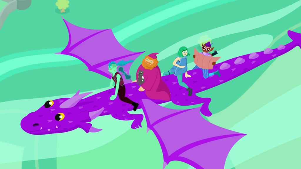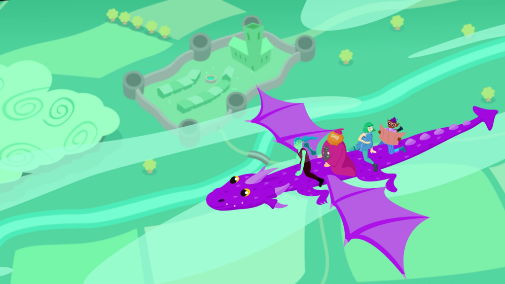 The screen wipes to a future point in time, where the adventurers, including the wizard’s new cat, are riding the back of the purple dragon, as it glides across the sky. Down below are clouds wizzing past, and the landscape below slowly goes by. A walled-off settlement, a large forest, a winding river, and lots of farmland are visible from this height.