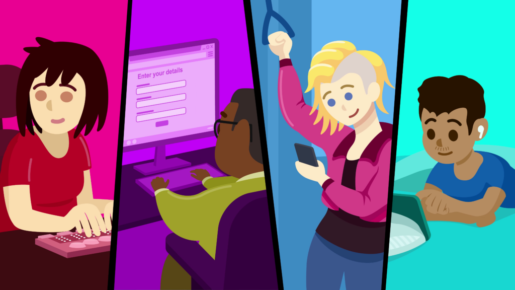 Four different real-world scenarios cut in. One of the braille display user, one of the woman on the subway, one of a dark-skinned man using a desktop PC to fill out a website form, and another of a south-Asian teenage boy with wireless earphones interacting with a mobile screen device in bed while laying on his stomach.